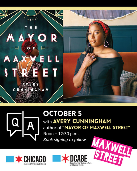 Author Avery Cunningham came to the Maxwell Street Market on October 5th, 2025 to present a book reading and signing. Her novel, The Mayor of Maxwell Street, tells the story of an ambitious Black debutante who enlists a speakeasy manager to help her identify the head of a crime syndicate in Prohibition era Chicago. Her main characters frequent the neighborhood nightlife and the Sunday Market in the 1920s.
